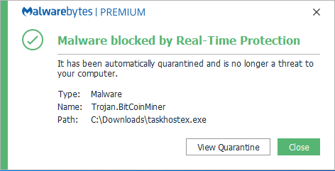 Malwarebytes can detect and remove Trojan.BitcoinMiner without further user interaction.