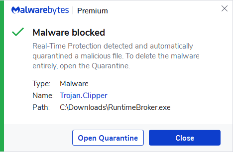 Malwarebytes can detect and remove Trojan.ClipBanker without further user interaction.