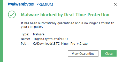Malwarebytes can detect and remove Trojan.CryptoStealer.Go without further user interaction.