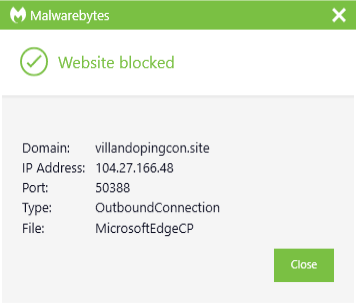 The domain villandopingcon.site was blocked by Malwarebytes because it was associated with a Trojan.