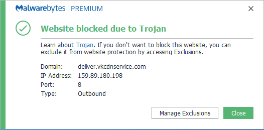 The domain vkcdnservice.com is blocked because it is associated with a Trojan detected by Malwarebytes as Trojan.BitCoinMiner.